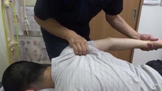 肩関節伸展位にて肩甲骨上角に付く肩甲挙筋のマッサージ