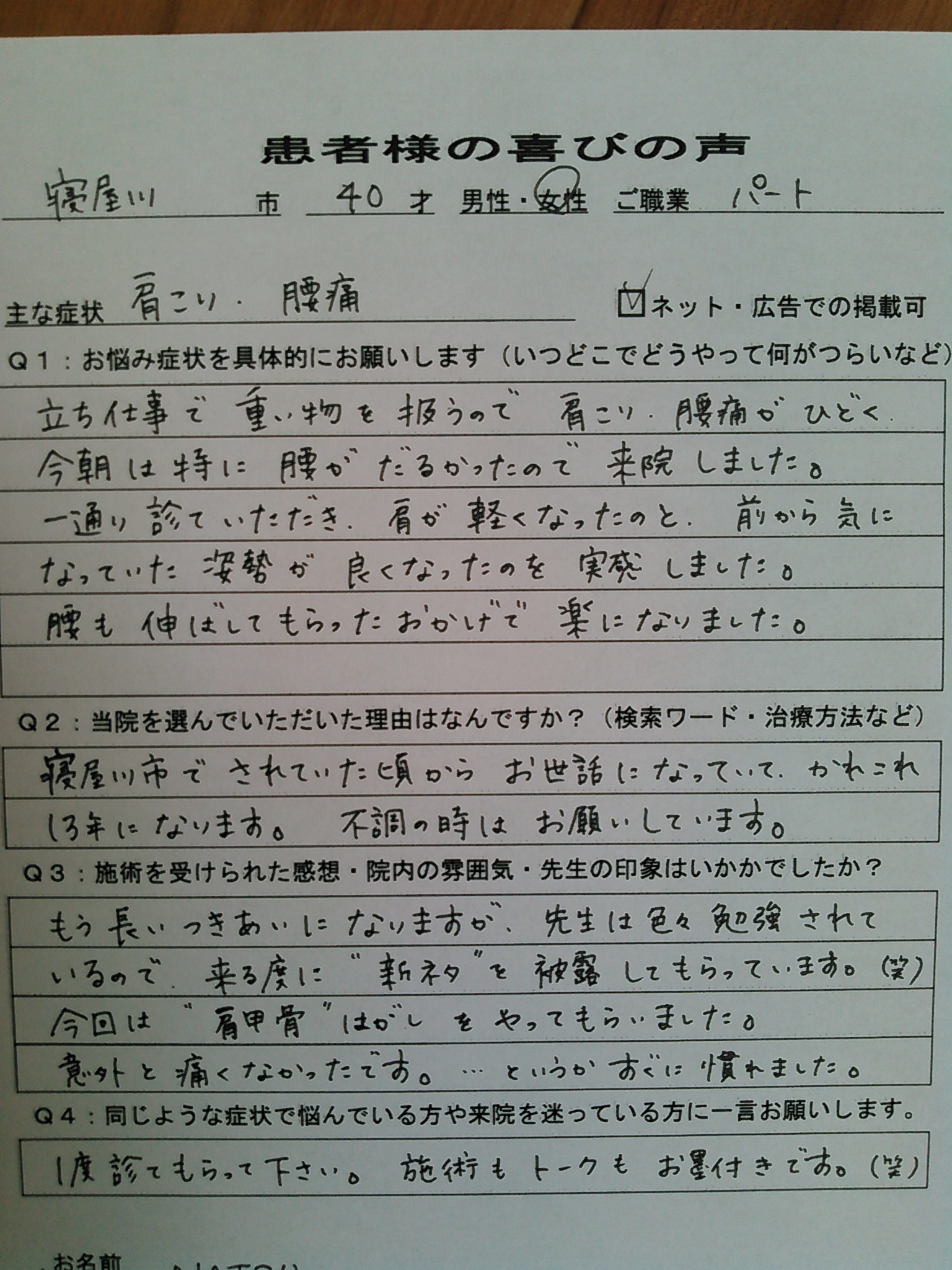 寝屋川市の腰痛患者様の声更新しました!